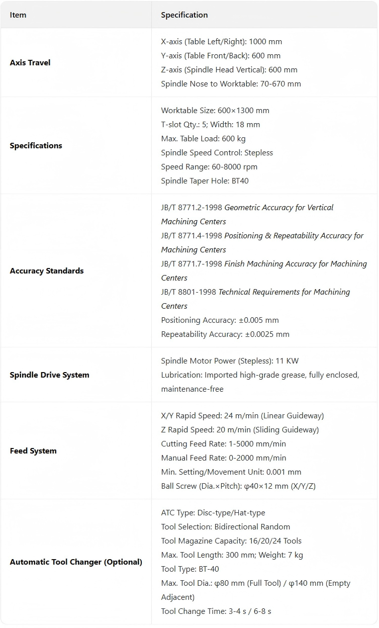 Travel Distances X-axis (table left/right travel): 1000 mmY-axis (table front/back travel): 600 mmZ-axis (spindle head up/down travel): 600 mmDistance from spindle face to table: 70-670 mmSpecifications Table size: 600*1300 mmNumber of T-slots: 5T-slot width: 18 mmMaximum table load: 600 kgSpindle speed control: SteplessSpindle speed range: 60-8000 rpmSpindle taper: BT40Machine Accuracy Standards JB / T 8771.2-1998 《Vertical Machining Centers – Geometric Accuracy Inspection》JB / T8771.4-1998 《Machining Centers – Linear Positioning Accuracy and Repeatability Inspection》JB / T8771.7-1998 《Machining Centers – Finishing Workpiece Accuracy Inspection》JB / T 8801-1998 《Machining Centers – Technical Conditions》Positioning accuracy: ±0.005 mm Repeat positioning accuracy: ±0.0025 mmSpindle Drive System Spindle motor power (stepless speed regulation): 11 kWSpindle lubrication: Using imported high-grade grease, fully enclosed, maintenance-freeFeed System X/Y axis rapid traverse speed: 24 m/min (X/Y axes with linear guides)Z axis rapid traverse speed: 20 m/min (Z axis with sliding guide)Cutting feed rate: 1~5000 mmManual feed rate: 0~2000 mmMinimum setting and movement unit: 0.001 mmBall screw (diameter × pitch): φ40×12 mm (X, Y, Z)Automatic Tool Change (Optional) ATC type: Disk type/Umbrella typeTool selection method: Bi-directional arbitraryTool magazine capacity: 16/20/24 toolsMaximum tool length: 300 mmMaximum tool weight: 7 kgTool type: BT-40Maximum tool diameter: φ80 (full tool state) φ140 (empty adjacent tool state)ATC time: 3-4 s / 6-8 s