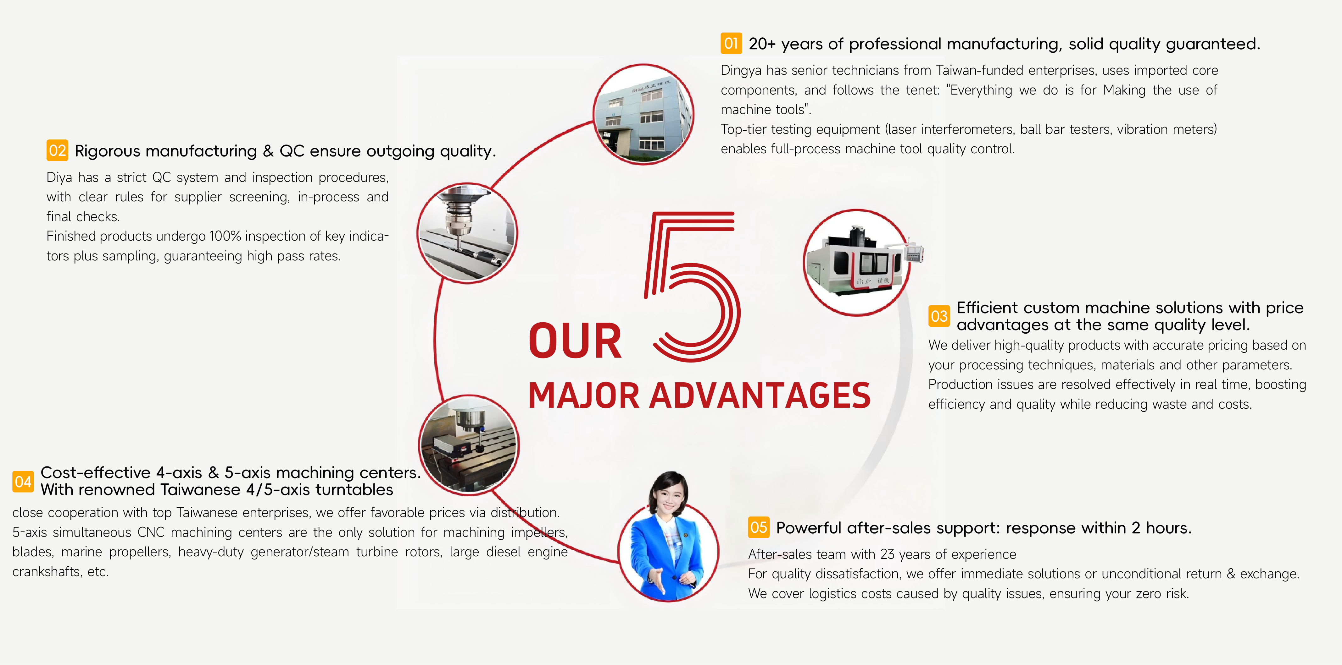 Dingya Machine Tools, with over 20 years of technical heritage from Taiwan-funded enterprises, focuses on R&D and production of cost-effective 3/4/5-axis machining centers. We cover processing scenarios of complex workpieces such as impellers and heavy-duty rotors, provide customized machine tool solutions on demand, control product quality through strict full-process inspection, and guarantee 2-hour rapid after-sales response. We offer one-stop services throughout the entire life cycle of equipment for customers—from pre-sales technical consultation and solution customization to post-sales equipment operation and maintenance, as well as spare parts supply. Dingya machining centers can effectively help customers improve operational efficiency, reduce maintenance costs, boost corporate profit growth, and maintain a leading position in the highly competitive market.